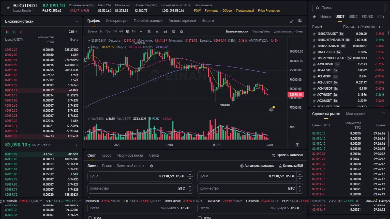 Спотовый сегмент — популярная классическая форма торговли на любой криптобирже. Это процесс купли-продажи цифровых активов с моментальной поставкой. То есть, покупатели сразу получают свою валюту после ее приобретения, что позволяет им быстрее реагировать в условиях рыночных колебаний. Платформа предлагает огромный выбор активов, включая популярные единицы, такие как Bitcoin, Ethereum, и множество альткоинов. Действуют функции OCO-ордеров, стоп-лоссов и тейк-профитов.
