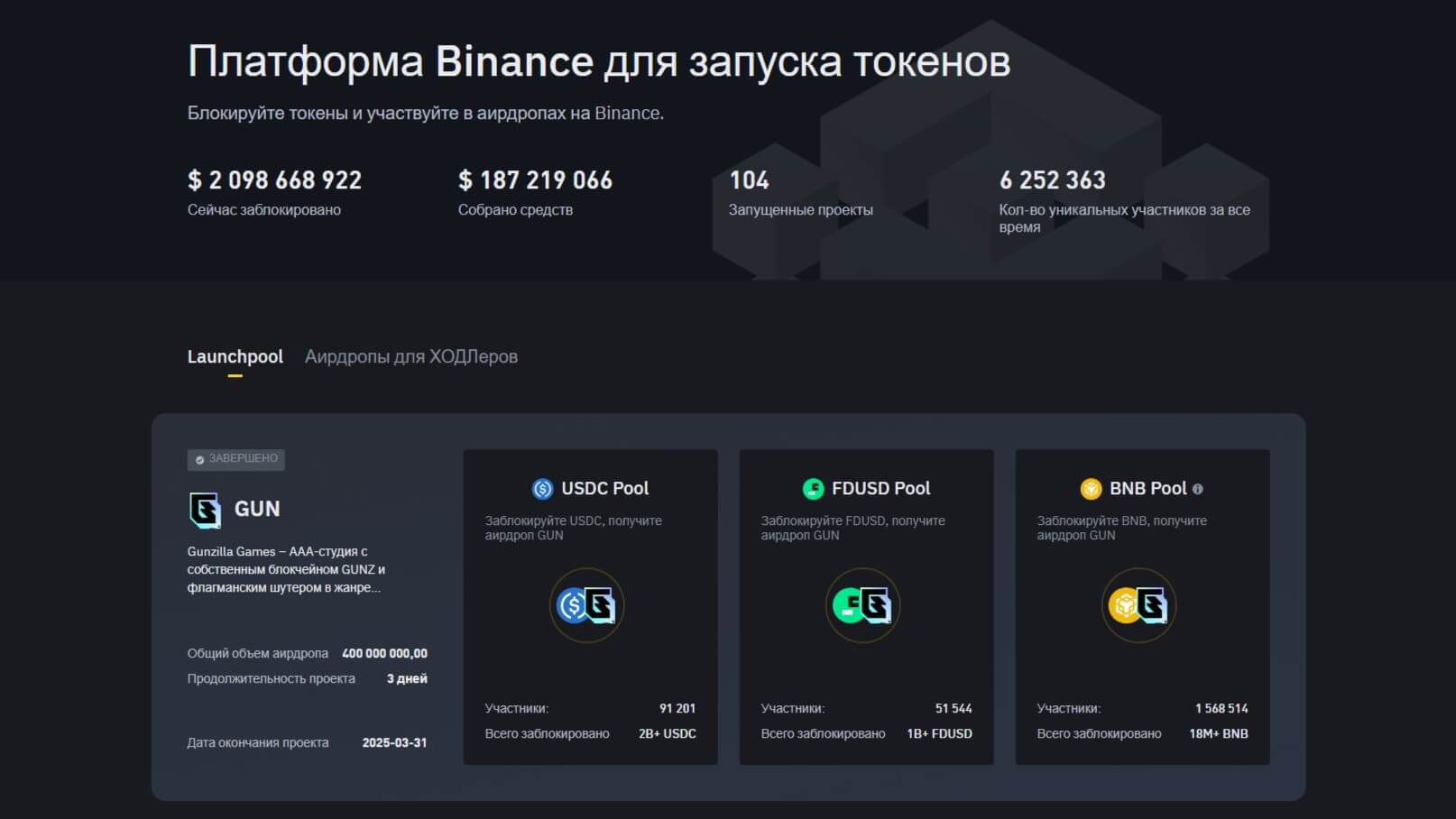 Launchpool — это платформа Binance, которая позволяет пользователям получать новые токены за счет стейкинга своих активов. Этот метод предоставляет возможность поддерживать новые проекты, получая при этом пассивный доход. Запущенные через Launchpool токены инвестиционно привлекательны, так как часто, в дальнейшем, появляются в листинге Binance. Участники могут блокировать BNB, BUSD или другие активы, чтобы получать премии в виде новых токенов.