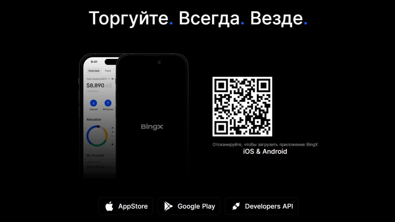 Для активных участников биржи очень важно всегда быть на связи, мониторить состояние рынка. BingX предоставляет полноценное мобильное приложение для устройств на iOS и Android. Оно способно полноценно заменить веб-версию, так как содержит все тот-же инструментарий для управления теханализом и разными ордерами (лимитными, стоп-ордерами, рыночными). А еще, здесь также предусмотрена продвинутая система безопасности и есть уведомления, оповещающие пользователей об изменениях на рынке.