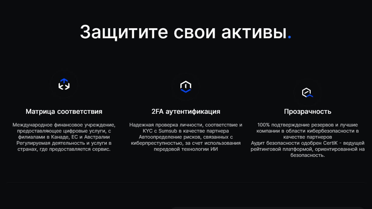 Биржа реализует многоуровневую систему безопасности, включая 2FA, холодное хранение активов и шифрование данных.