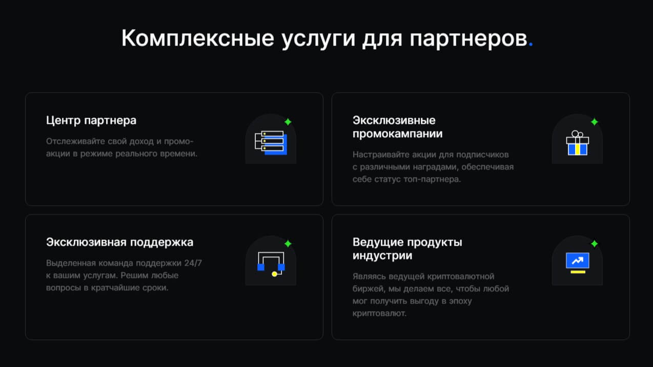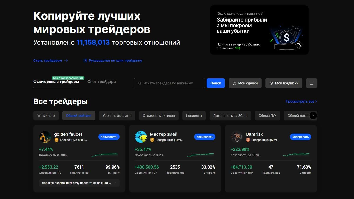 Не все приходят на биржу с «золотой криптовалютной ложкой». Для клиентов, которые пока только разбираются с функционалом, биржа предлагает функцию копитрейдинга. Можно выбирать из списка успешных продавцов наиболее привлекательный вариант и копировать его сделки. При этом опытный трейдер также получает доход от подписчиков, что обуславливает взаимовыгодное сотрудничество.