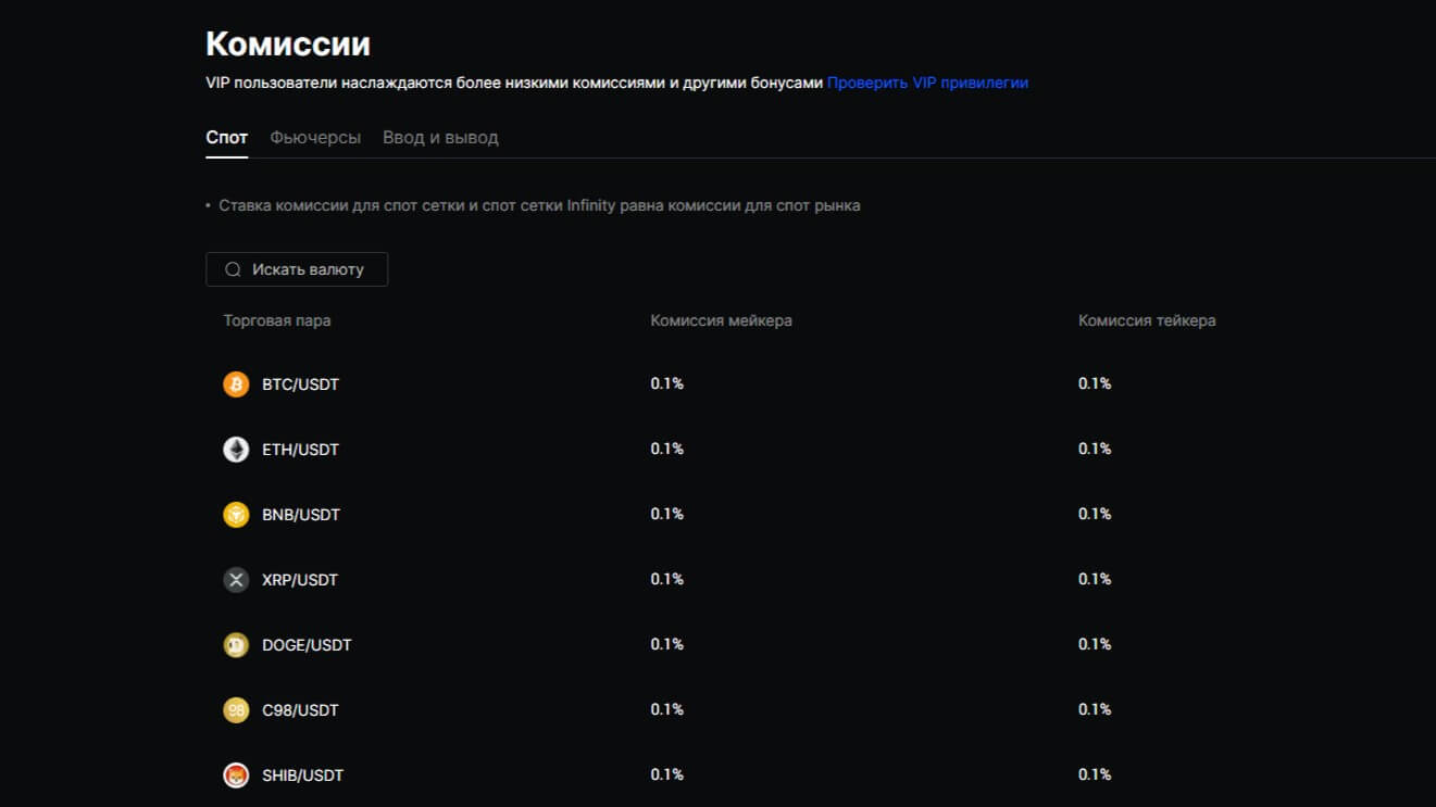 BingX предлагает низкие комиссии – 0.1% для спотовой торговли и переменные ставки для фьючерсных контрактов в зависимости от ликвидности.