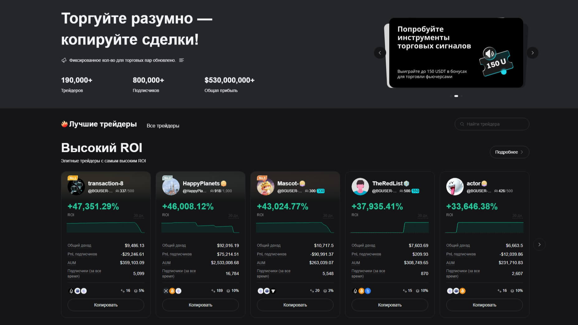 Далеко не каждый участник криптовалютного рынка может разрабатывать собственные эффективные стратегии. Особенно это касается новичков для которых предусмотрен сервис копитрейдинга. Платформа предоставляет список успешных игроков, у которых неопытные игроки могут копировать стратегии без самостоятельного анализа рынка. Разумеется, «донорам» это тоже выгодно, так как им поступает комиссионный доход за подписчиков.