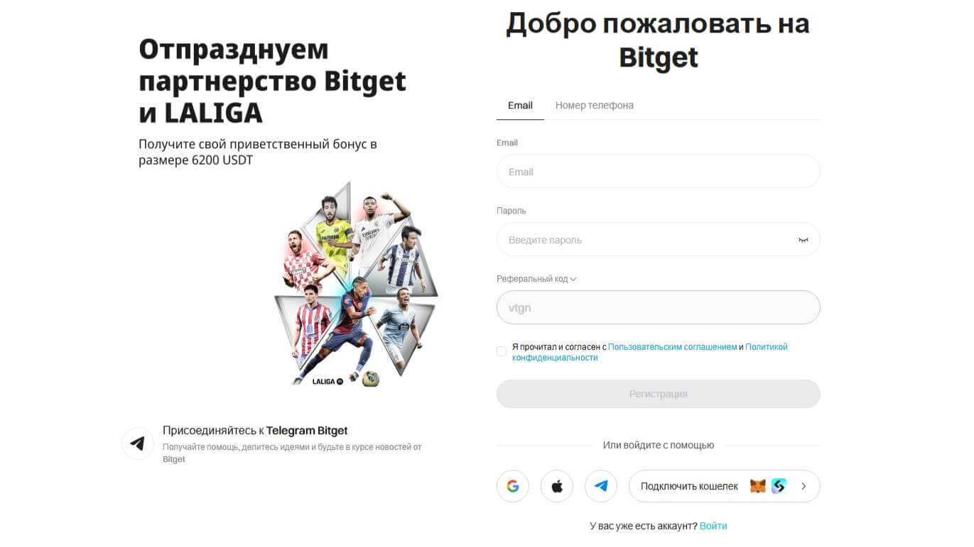 Создание учетной записи на Bitget — простейшая процедура, которая отнимет всего несколько минут. Для генерации аккаунта требуется указать электронную почту или номер телефона, обязательно актуальные, потому что туда придет код подтверждения. Базовый доступ учетной записи позволяет пополнять счет и даже совершать торговые операции, но с учетом ограничений по лимиту на вывод средств.
