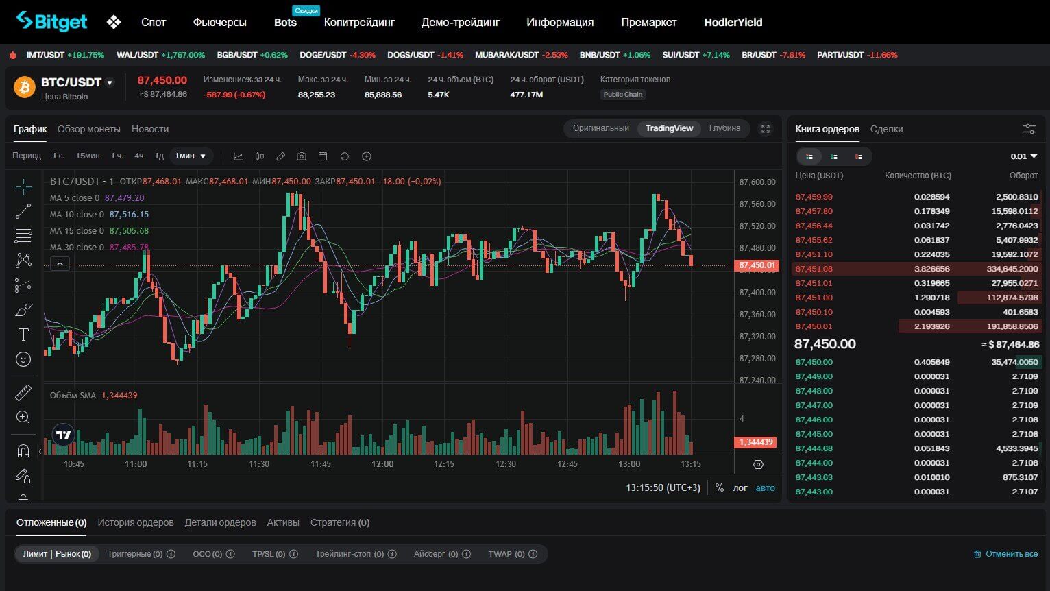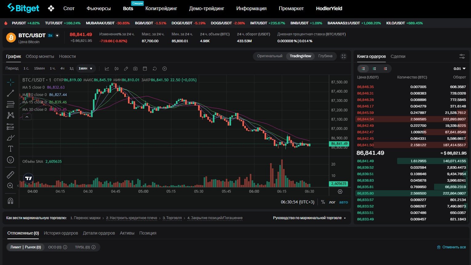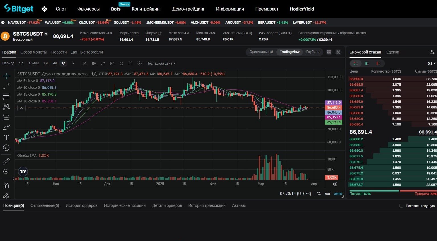 Демо на Bitget полноценно имитирует актуальные рыночные условия, в том числе движение цен, ликвидность, спреды. Здесь также можно открывать виртуальные сделки, использовать стоп-ордера, а кроме того, управлять рисками и нарабатывать навыки без финансовых угроз.