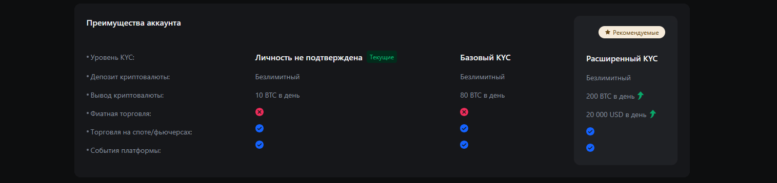 Процедура KYC на Bybit и MEXC схожа: необходимо загрузить паспорт или другой удостоверяющий личность документ, а также пройти селфи-проверку. Верификация открывает доступ к P2P-торговле, повышает лимиты на ввод и вывод средств, а также позволяет участвовать в различных программах биржи. Без KYC на MEXC можно совершать небольшие транзакции, а на Bybit будут ограничения на вывод. Процесс проверки занимает от нескольких минут до 24 часов.
