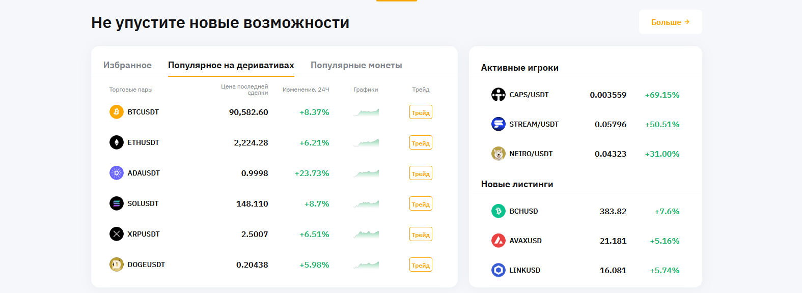 Bybit — самая популярная криптобиржа для фьючерсной торговли и не только. Платформа предлагает интуитивно понятный интерфейс, низкие комиссии и большой выбор инструментов для торговли. Здесь можно торговать деривативами, опционами и спотовыми активами. Bybit особенно ценят профессиональные трейдеры за высокую ликвидность и мощные инструменты анализа. Помимо классических торговых пар, биржа поддерживает инновационные продукты, такие как крипто-опционы и торговля с повышенным кредитным плечом.