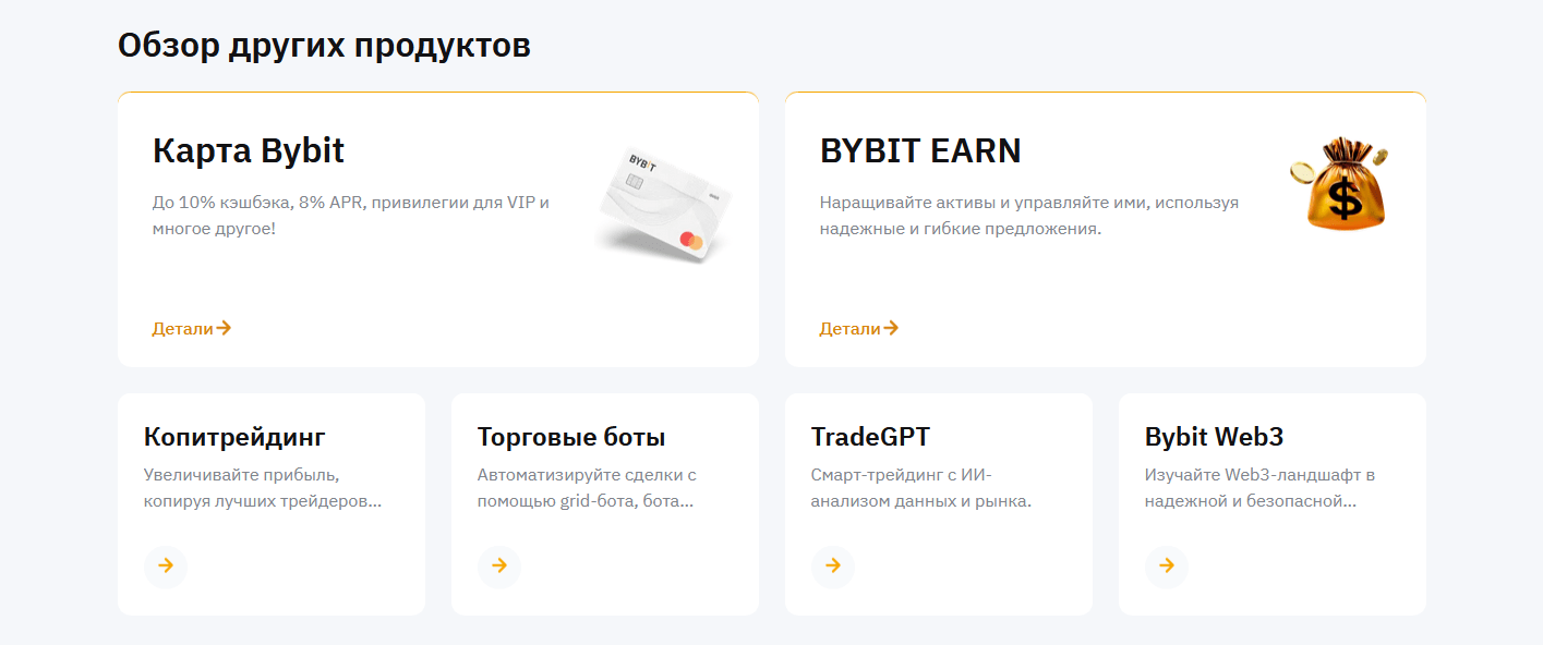 Для всех тех, кто хочет пользоваться инструментами для пассивного доход, Bybit предлагает Bybit Earn — платформу, включающую стейкинг, депозиты с фиксированной процентной ставкой и участие в DeFi-проектах. NFT-маркетплейс позволяет продавать, покупать и хранить цифровые коллекции, расширяя инвестиционные возможности пользователей.
