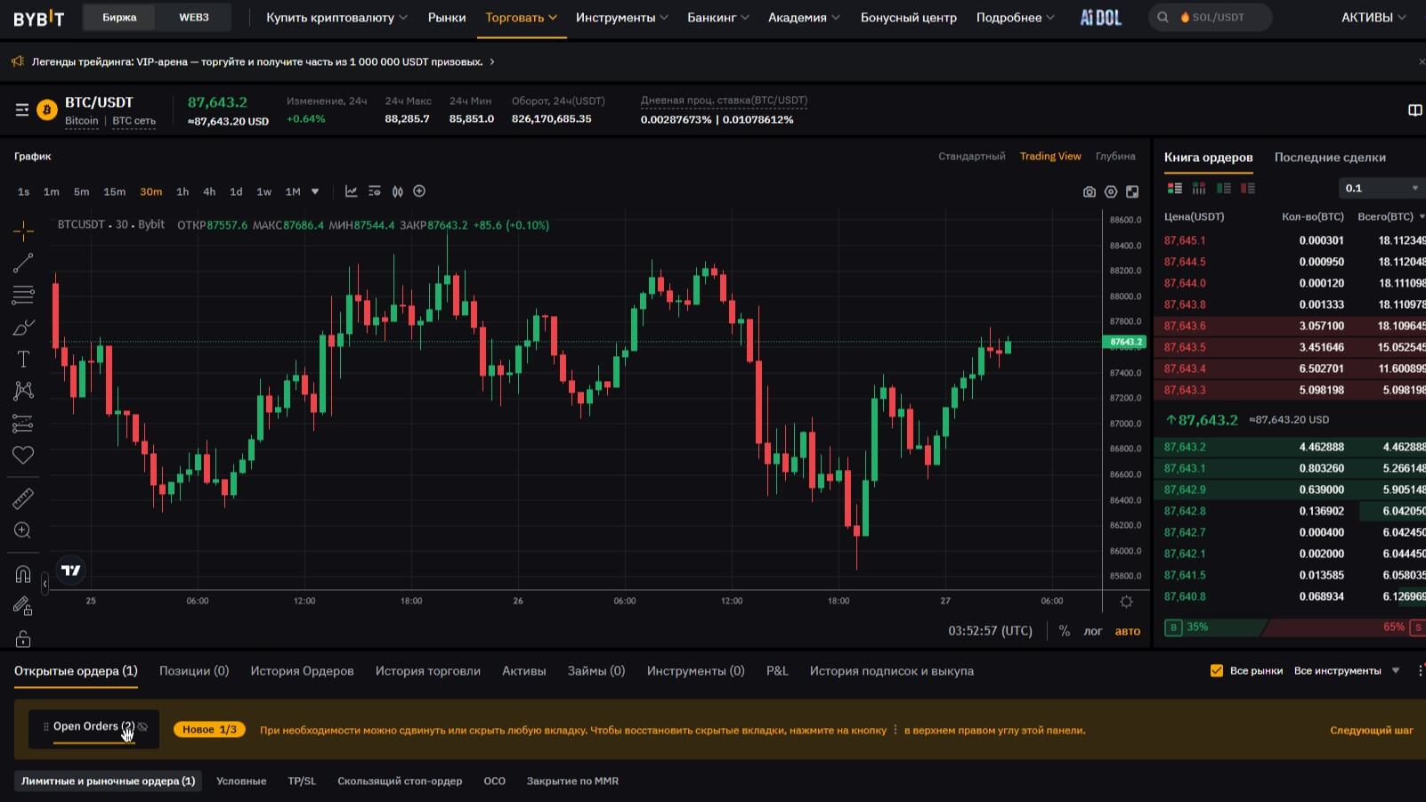 В нише спотовой торговли Bybit, у пользователей есть выбор из множества криптопар, среди которых находятся такие активы, как BTC, ETH и USDT, а также десятки других валют с хорошей ликвидностью и приемлемыми комиссиями. Можно использовать лимитные, рыночные и условные ордера для управления сделками, а для опытных пользователей доступны продвинутые инструменты технического анализа и возможность применения API для алгоритмической торговли.
