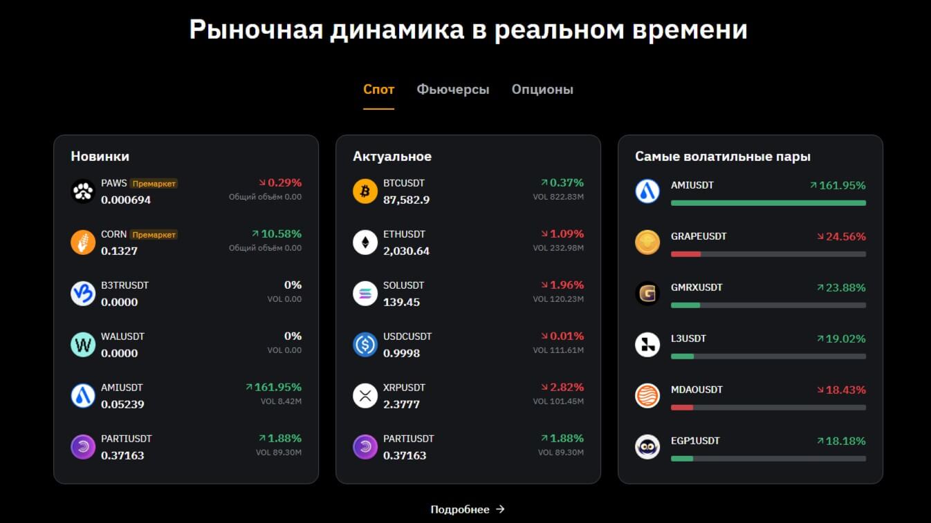 Биржа предлагает разнообразный набор инструментов, включающий спотовую и деривативную торговлю. Платформа ориентирована на высокую скорость исполнения ордеров, гибкость в выборе торговых стратегий и обладает глубокой ликвидностью.