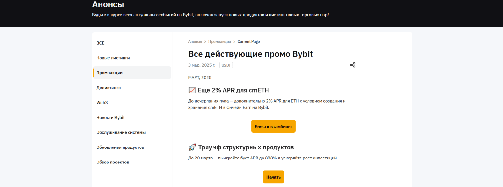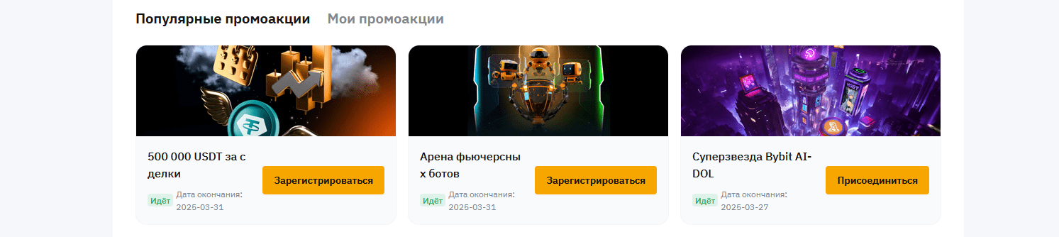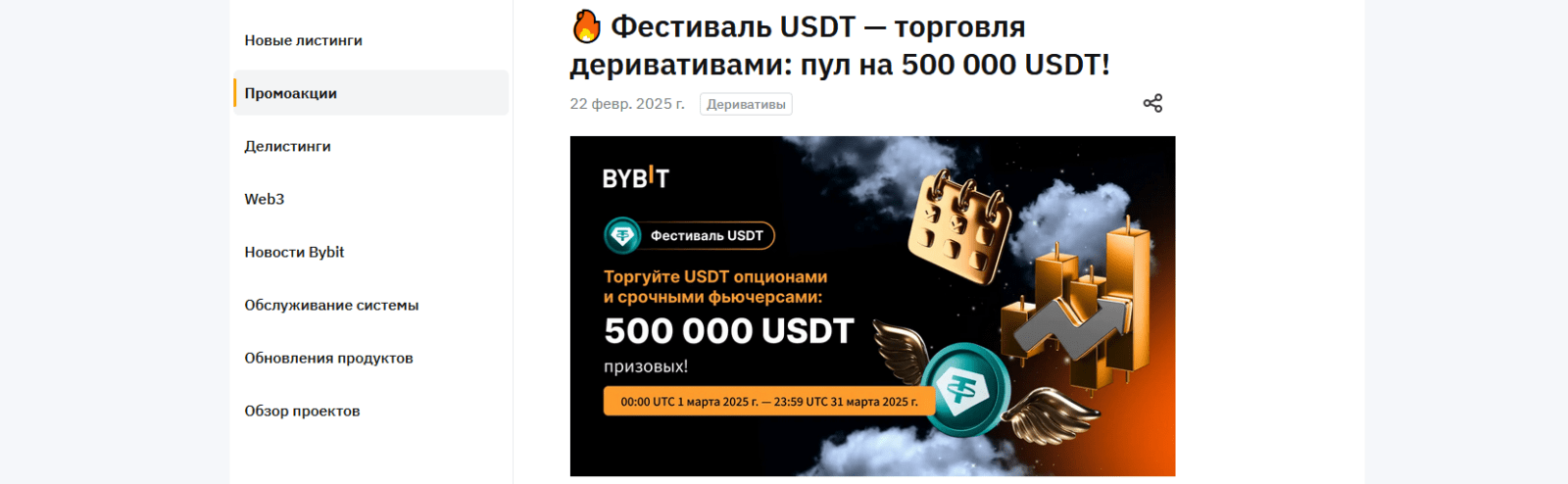 Bybit регулярно обновляет список предложений, обеспечивая трейдерам доступ к выгодным условиям. В марте 2025 года доступны следующие акции и бонусные программы, направленные на увеличение доходности пользователей: