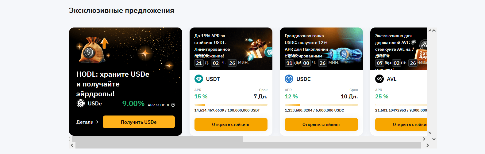Bybit предлагает пользователям возможность зарабатывать пассивный доход за счет стейкинга криптовалют. Гибкие условия позволяют замораживать средства на разные сроки с разными процентными ставками. Чем больше сумма и срок стейкинга, тем выше доходность. Некоторые бонусные программы предлагают дополнительные проценты для активных участников, что делает этот инструмент еще более прибыльным.