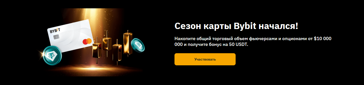 Bybit предлагает новым пользователям карту с бонусными средствами на сумму до $500. Для её получения необходимо пройти регистрацию, верификацию KYC и выполнить условия акции, например, внести первый депозит или совершить торговые операции на сумму больше 100$. Карта позволяет получить дополнительные преимущества при торговле.