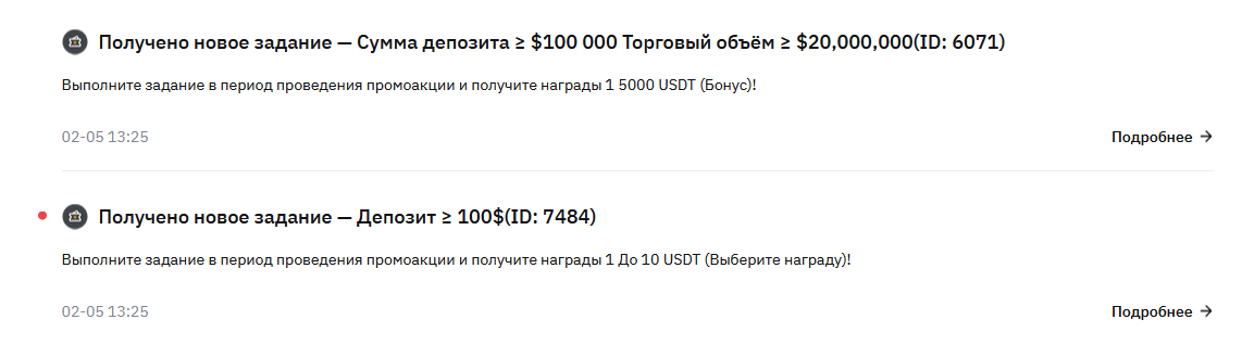 Платформа регулярно проводит задания, за выполнение которых пользователи получают бонусы. Это могут быть торговые миссии, пополнение счета, приглашение друзей или участие в акциях. Накопленные бонусы можно использовать для торговли, получения скидок или увеличения прибыли.