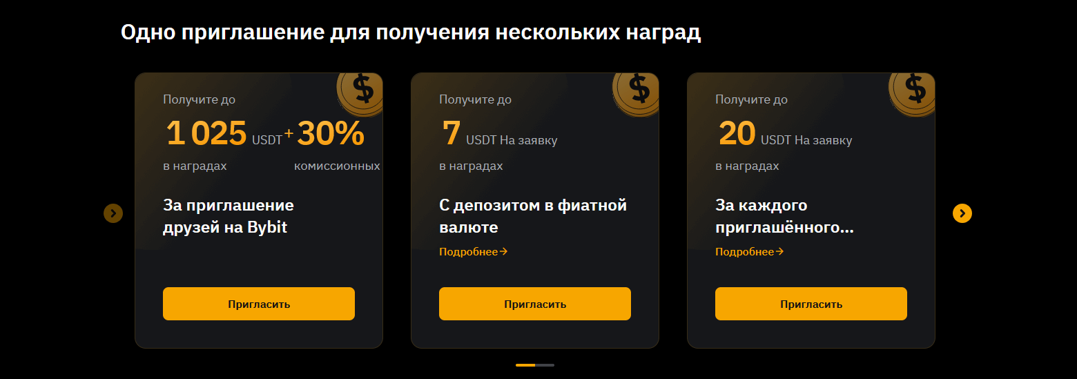 Привлекая друзей на платформу, трейдеры получают бонусы за каждого нового пользователя, который зарегистрируется и начнет торговать. Размер вознаграждения зависит от активности реферала и его торгового оборота. Кроме того, Bybit предлагает многоуровневую программу, где можно получать проценты не только от приглашенных пользователей, но и от их рефералов, что делает участие особенно выгодным. Сделать свою реферальную ссылку можно в специальном разделе “Реферальная программа” на сайте через меню “Подробнее”.