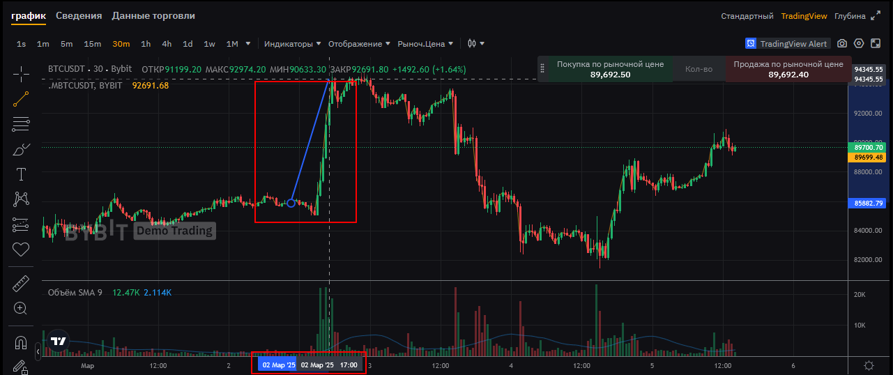 Допустим, эфириум в начале дня торгуется на уровне $3 200, а по теханализу ожидается рост. Трейдер замечает, что цена пробивает уровень сопротивления на $3 220 с увеличением объёмов — это хороший сигнал для входа в лонг. Он покупает эфир по $3 225, ставит стоп-лосс на $3 200 и тейк-профит на $3 275. В течение дня цена действительно достигает $3 275, сделка закрывается в плюс. За одну сделку трейдер заработал 1,5%.