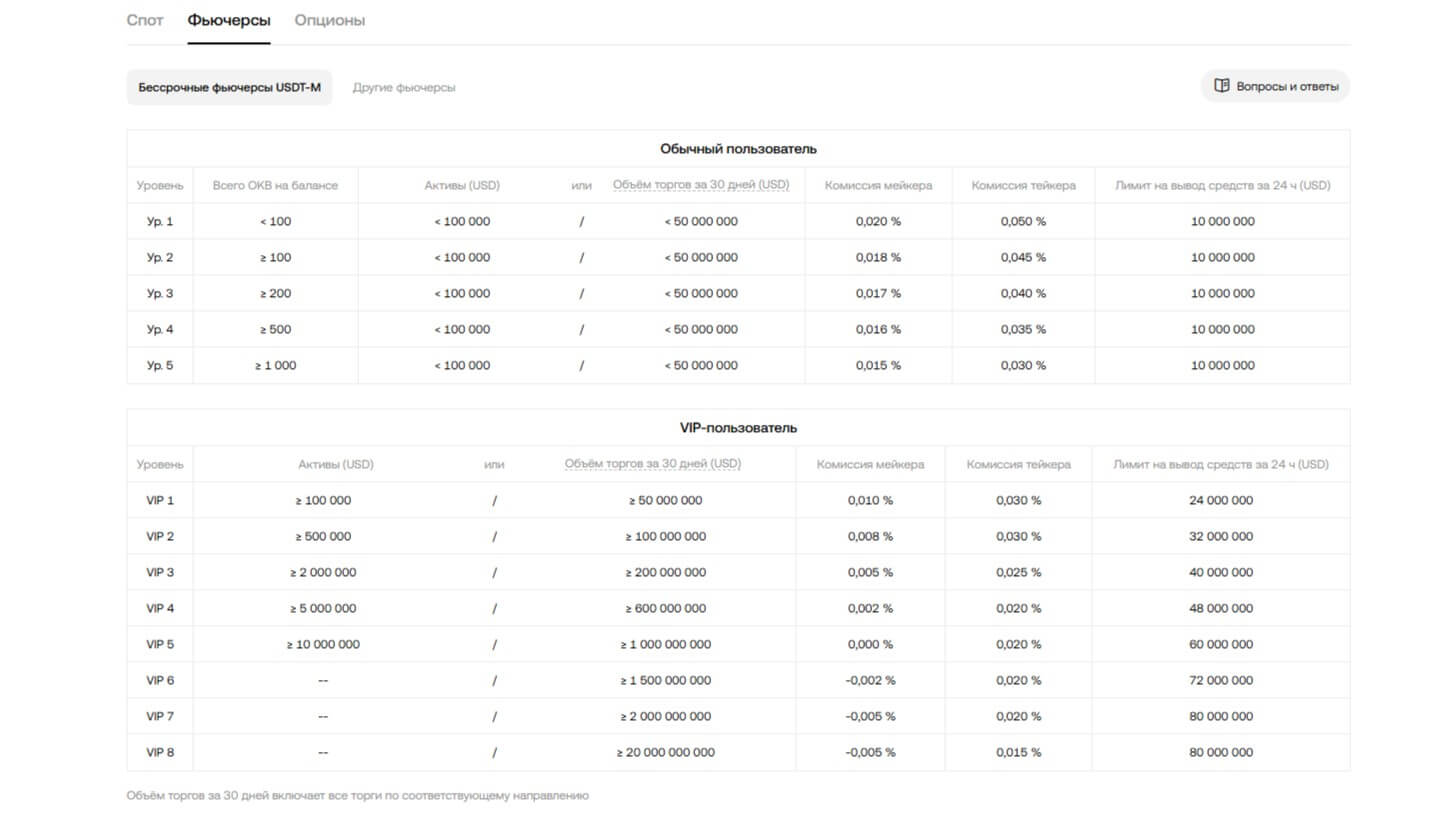 У мейкеров (добавляющих ликвидность) комиссии начинаются от 0,02%, а для тейкеров (пользователей, забирающих ликвидность) — от 0,05%. VIP-трейдеры, совершающие крупные сделки, могут получить скидки, снижая ставки до 0,01% и ниже.