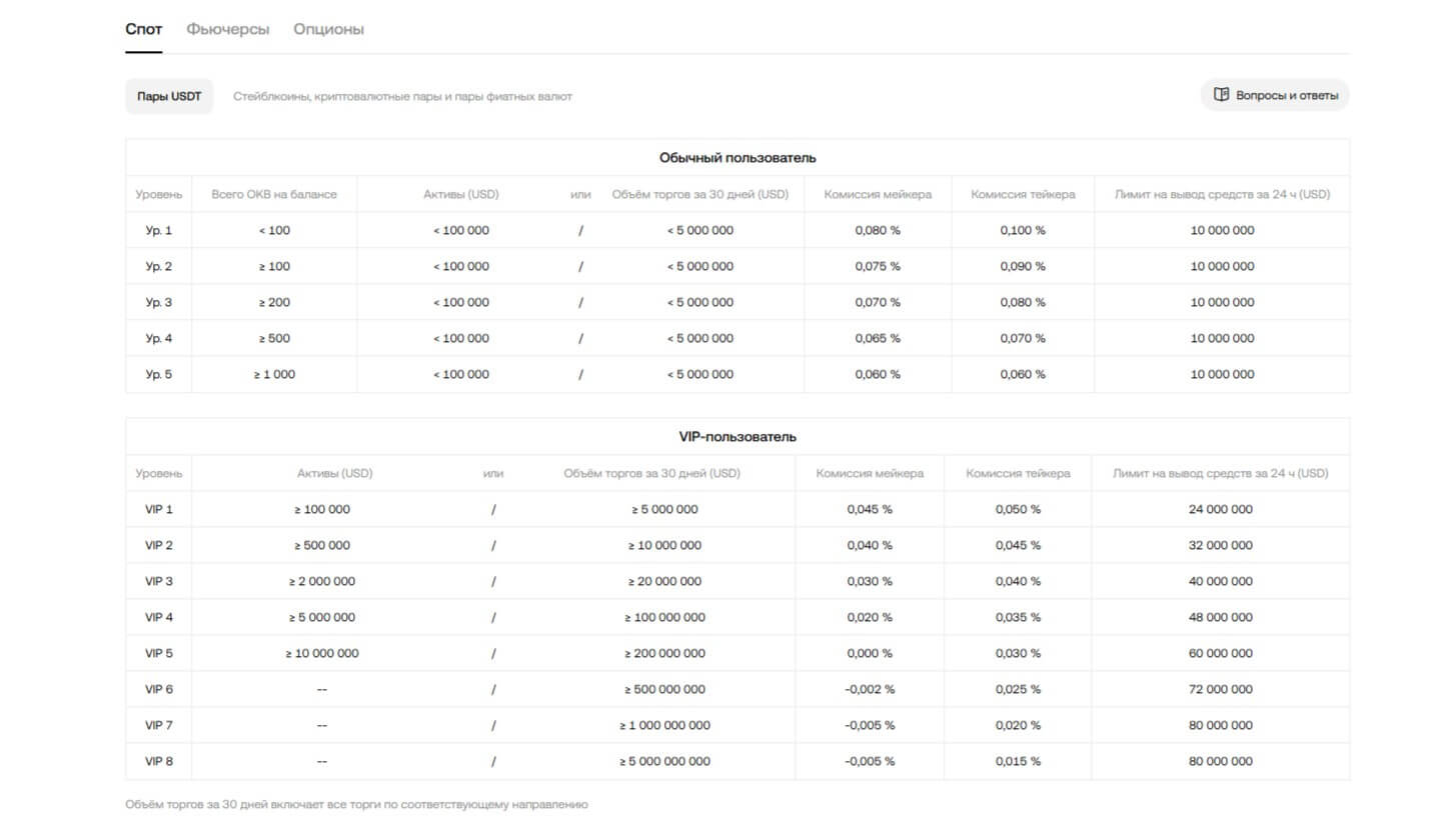 В спотовом сегменте комиссия для тейкеров-мейкеров 0,1%. Но можно сократить издержки за счет владения токенами OKB, которые предоставляют скидки на торговые сборы. Уровни VIP также позволяют снизить сборы до 0,02% и даже ниже для тех, кто фиксирует высокие торговые объемы. Помимо этого, для участников P2P биржа не устанавливает процентные ставки, что делает рынок криптовалют выгодным в этом сегменте.