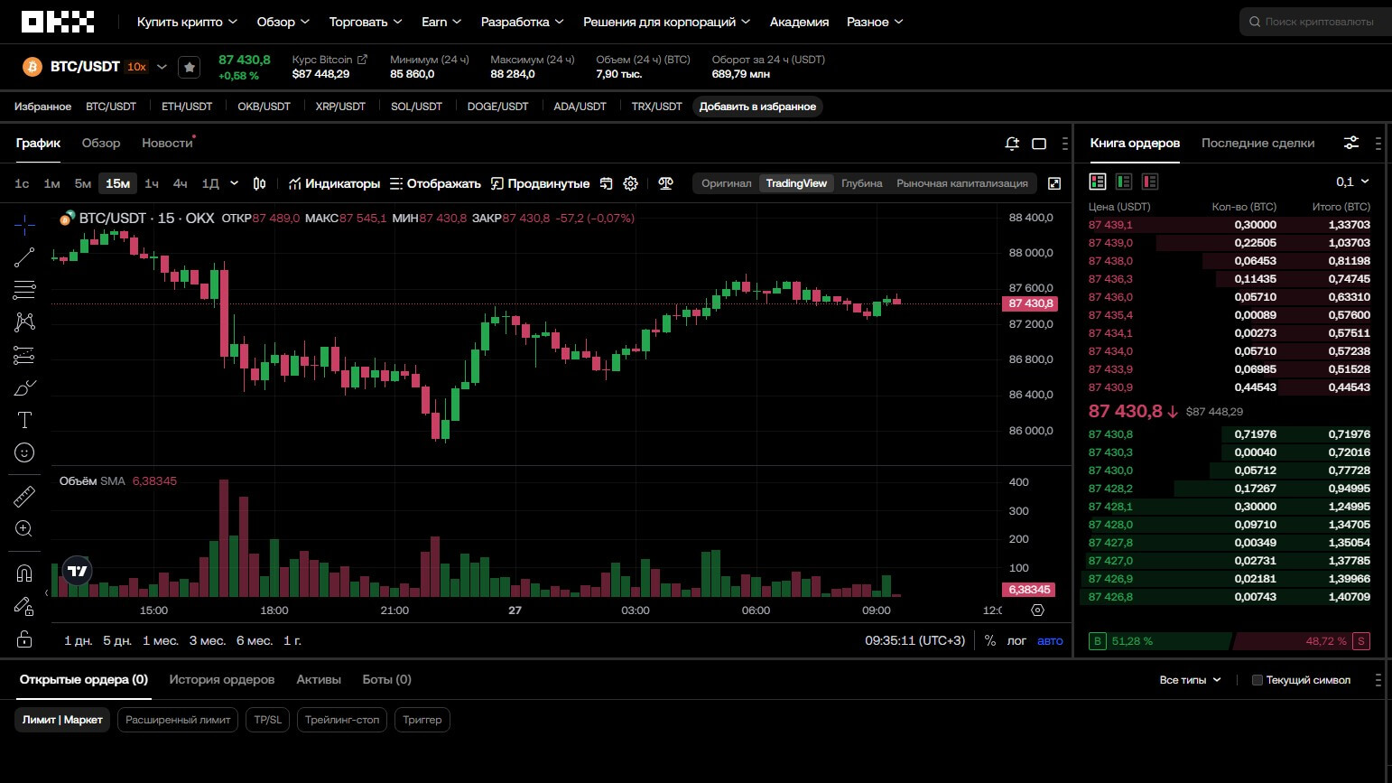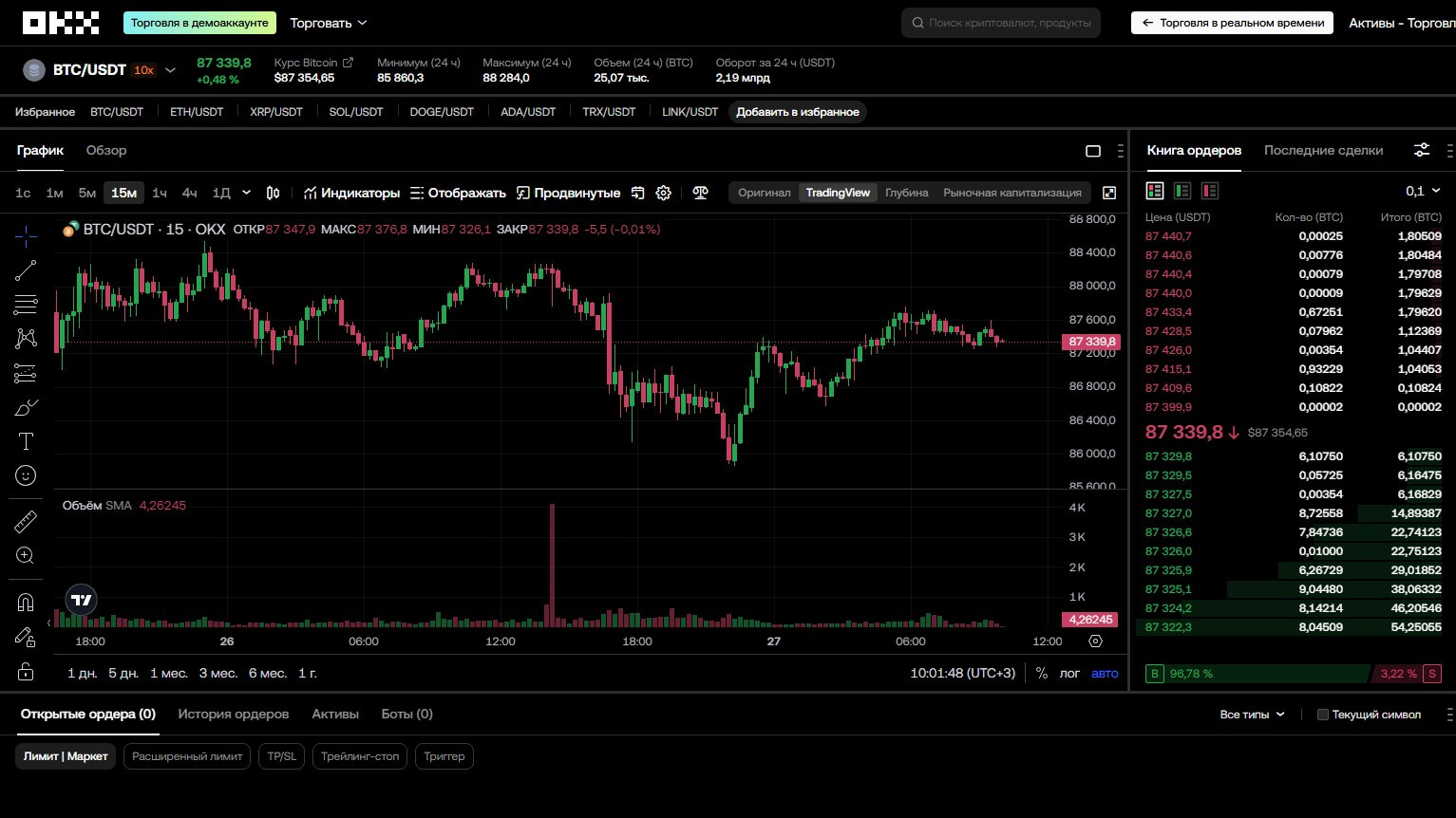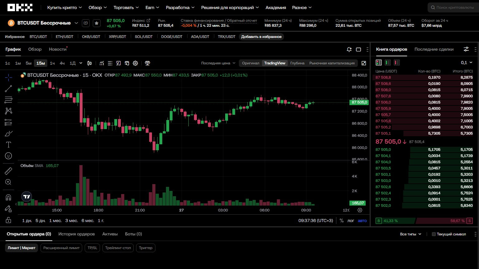 Кроме того, OKX предоставляет встроенные инструменты теханализа, в частности, графики TradingView, индикаторы, настройку пользовательских шаблонов.