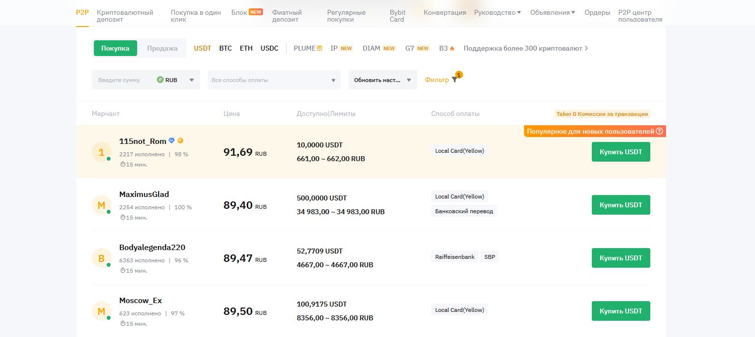Bybit – это одна из ведущих криптобирж, предлагающих удобную P2P-торговлю без посредников. Платформа предоставляет возможность покупки и продажи криптовалют напрямую между пользователями с использованием различных методов оплаты, включая банковские переводы и электронные кошельки. Эскроу-система защищает обе стороны сделки, гарантируя безопасность транзакций. Bybit активно развивает P2P-направление, предлагая низкие комиссии, быстрые переводы и высокую ликвидность. На платформе доступен широкий выбор криптовалют, что делает ее удобным инструментом как для трейдеров, так и для долгосрочных инвесторов.