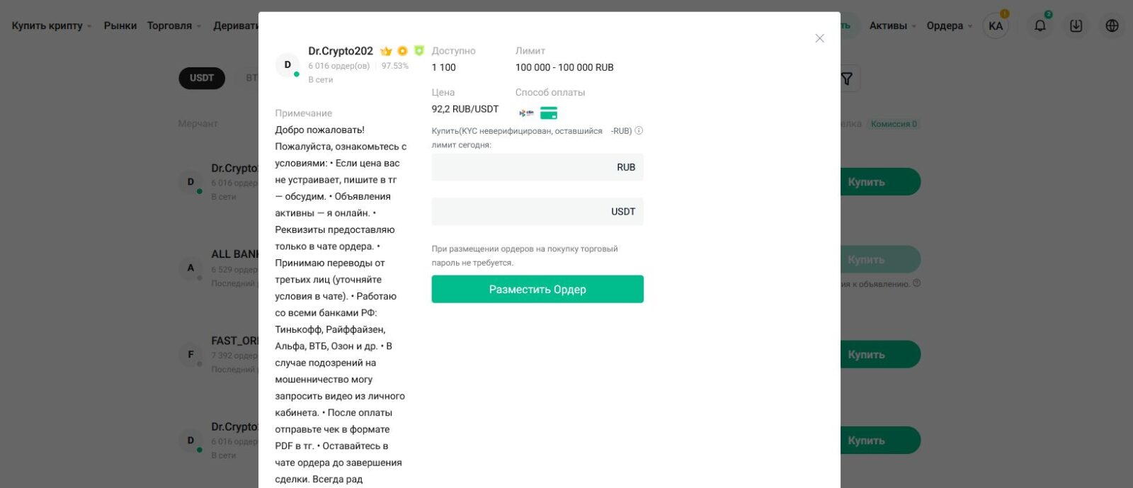 Прежде всего, обратите внимание на репутацию и рейтинг контрагента. P2P-платформы обычно предоставляют информацию о предыдущих сделках пользователя, для того чтобы вы могли оценить его надежность. Вторым важным аспектом является использование безопасных методов платежа.